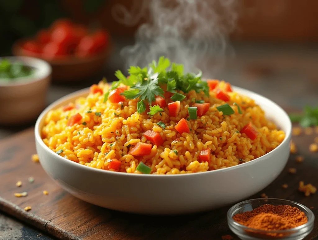 Mexican-style rice, a vibrant and flavorful side dish with tomatoes, onions, and a perfect blend of spices.