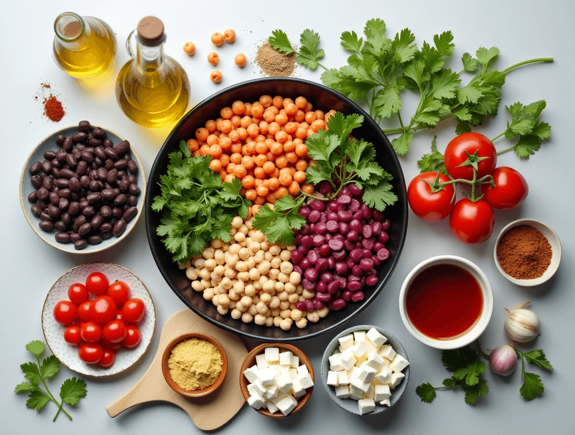 All the fresh ingredients you need for the perfect dense bean salad—packed with protein and vibrant flavors.
